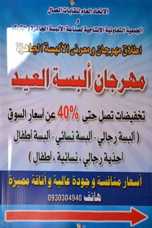 بمناسبة اقتراب موسم العيد وتلبيةً لحاجة الأسرة السورية من كل أصناف الألبسة الرجالية والنسائية والولادية افتتح الاتحاد العام لنقابات عمال سورية بالتعاون مع الجمعية التعاونية الانتاجية لصناعة الألبسة الجاهزة اليوم" مهرجان ومعرض الألبسة الجاهزة- ألبسة العيد"، في نادي عمال دمشق، بحضور ابراهيم عبيدو نائب رئيس الاتحاد العام لنقابات العمال و أعضاء المكتب التنفيذي للاتحاد العام.